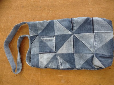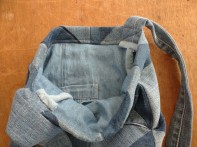 色違いのGパン2本を使って、幾何学模様をパッチワークで制作し表現したこと。Gパン生地を活用することで、強度的にも十分なバッグとなるように工夫しました。また、ワンピースのポケットをそのままポケットにするように位置を調節し、裏地として活用したところがポイントです。
