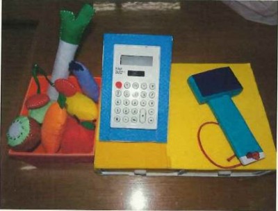 ・幼児自身の遊びを工夫・発展させるために、実物に似せた食べ物、レジスター、バーコード読み取りを作り、あえて電卓をつけることでリアル感を出した。