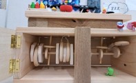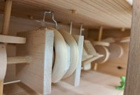 上の人形が思ったように動く様、中に色んな木を使ったり、なるべく余っていた木をつなぎ合わせて作りました。また、すべての羊がしっかり動くように、毛やつける位置を調整したり、思い通りの動きをするまで何度も作り直しました。他にも、羊のする動きによって手を針金か毛糸にするかを変えて、よりスムーズに動くようにしたり、下の構造が見えるように戸をつけたり、小さいネズミを作ったりして、にぎやかになる様に工夫しました。