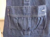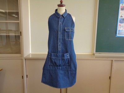 えりや前の合わせ部分はそのまま使用して、胸ポケットも残せるように裁断しました。ポケット口は、シャツのそで部分を活用したので、縫い代のしまつもなく製作時間の短縮になりました。底の部分は、ギャザーを入れてふくらみを作ったのでハンカチなどがスムーズに入ります。エプロン丈は、後ろ見ごろのすそをつけ足して自分サイズに調整しました。