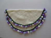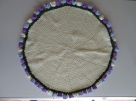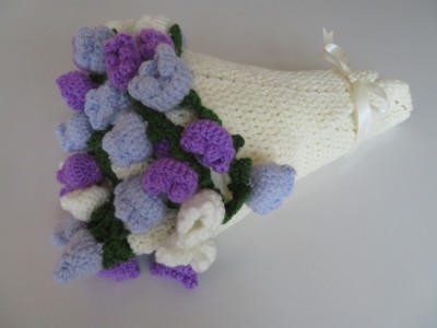 このブランケットは、半分に折ってひざ掛けにしたり、全部広げて体全体を覆うことができたりします。使わない時には、半分にした状態でくるくる巻くと花束のようになり部屋に飾ることもできるので、使用するのが楽しくなるブランケットです。製作にあたり工夫したことは、色選びと編み方です。色を選ぶ時、土台のブランケット部分は花を目立たせるためにアイボリー色を選びました。花の部分は落ち着いた色合いにするために、紫の同系色でまとめました。編む時は、きれいな円になるよう段数マーカーを使い、増し目の位置を何度も確認しながら丁寧に製作しました。花の部分は同じ形になるよう、何度もやり直して納得のいく大きさにそろえました。
